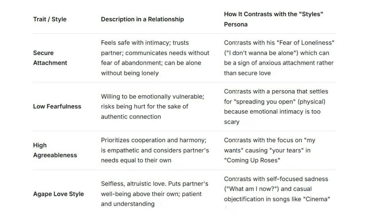 Harry Styles has rebranded his classic pop rock-star tropes (sex, drugs, and heartbreak) as modern emotional intelligence. However, by examining his work, it becomes clear that he is trapped in a cycle of physical pursuit and individual sadness. The personality traits required for deep love, secure attachment, selflessness, and the courage to endure boredom and conflict, are notably absent from his persona, replaced by a more cinematic, and ultimately safer, performance of vulnerability.